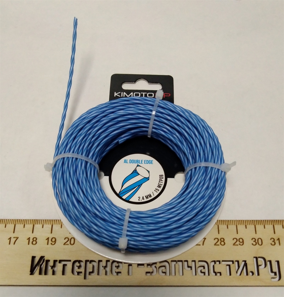 Двухкомпонентная леска толщиной 2.4мм изготовлена из нейлона с алюминиевой крошкой, что обеспечивает ей дополнительную прочность и увеличивает срок ее службы.